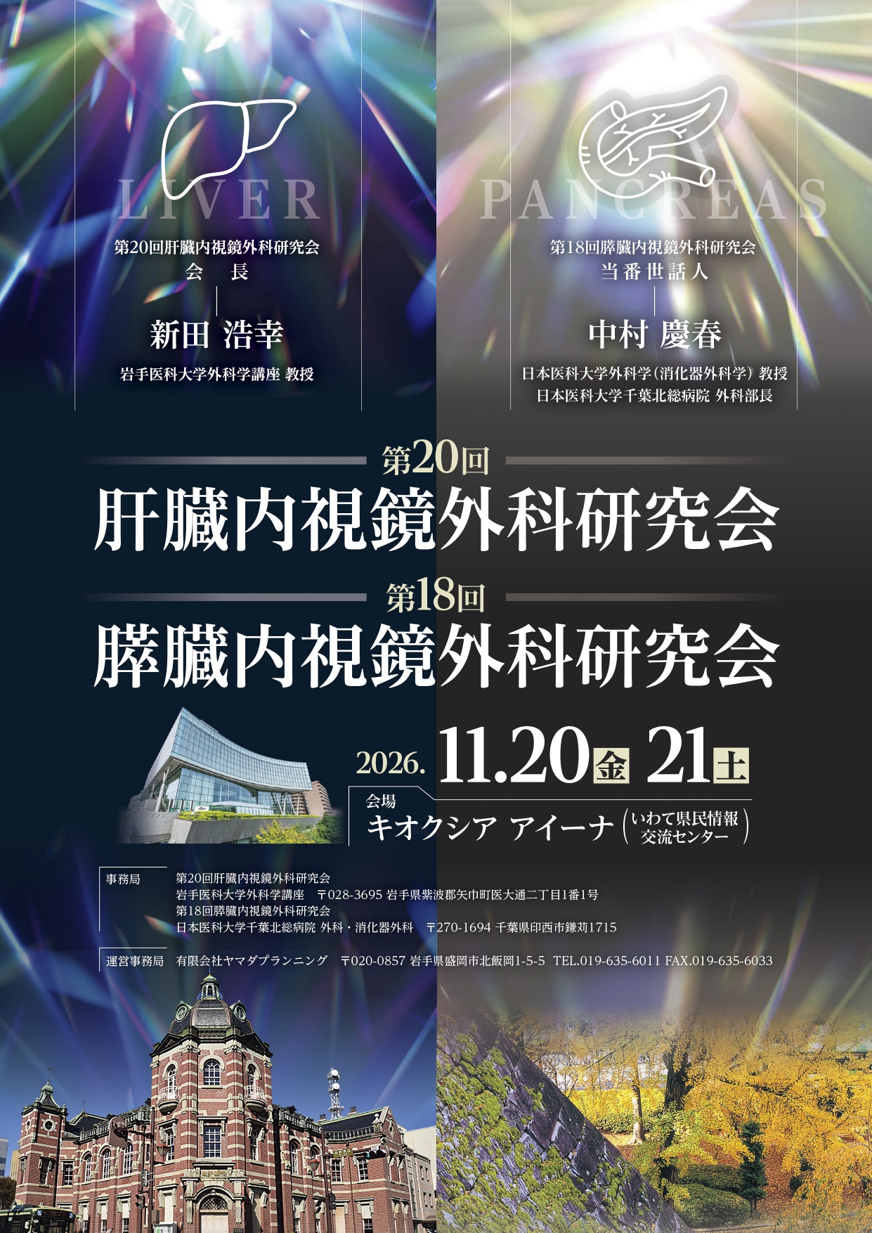 2025年1月21日 / 最終更新日時 : 2025年7月31日 admin 第19回肝臓内視鏡外科研究会 会長 東邦大学医学部外科学講座 一般消化器外科学分野 大塚由一郎 日時 2025年11月19日(水) 会場 京王プラザホテル(会場ホームページ) 運営事務局 日本コンベンションサービス株式会社 コンベンション事業部 事業推進部内 〒100-0013 東京都千代田区霞が関1-4-2 大同生命霞が関ビル14階 E-mail:jselps2025@convention.co.jp 研究会ホームページ